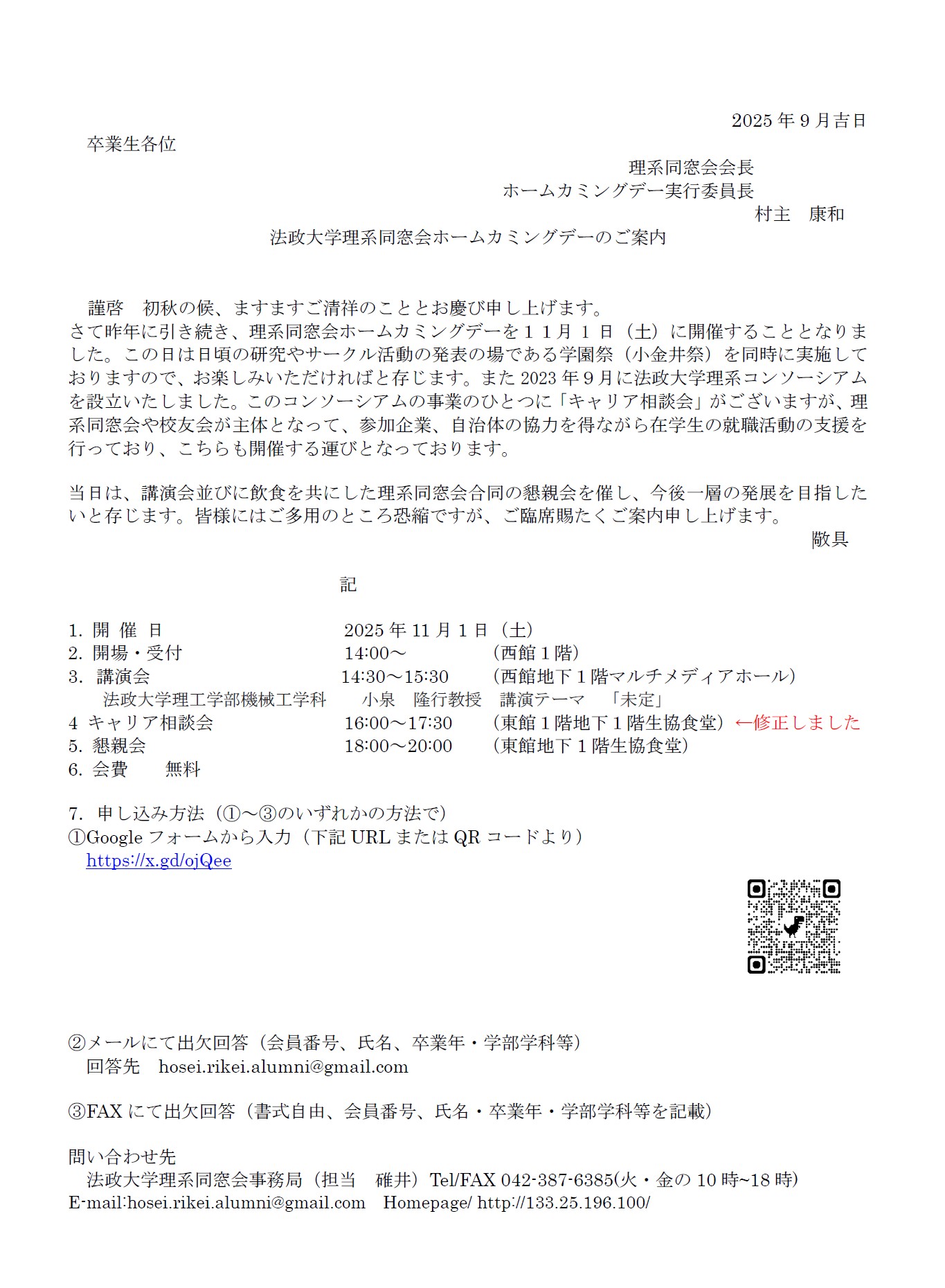 ホームカミングデー2025開催のご案内(2025年11月1日(金)14時00分~)